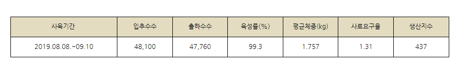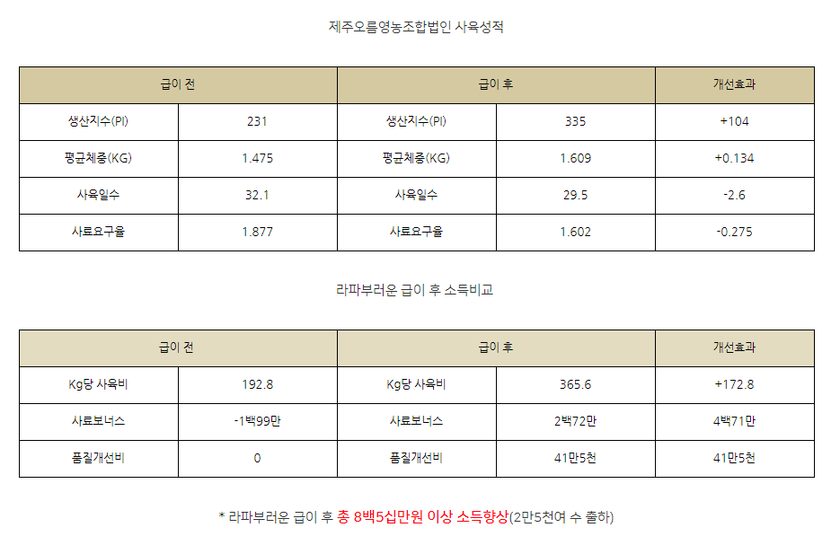 사료 톤당 4kg의 비율로 라파부러운을 첨가 급이 후 5일 이후부터