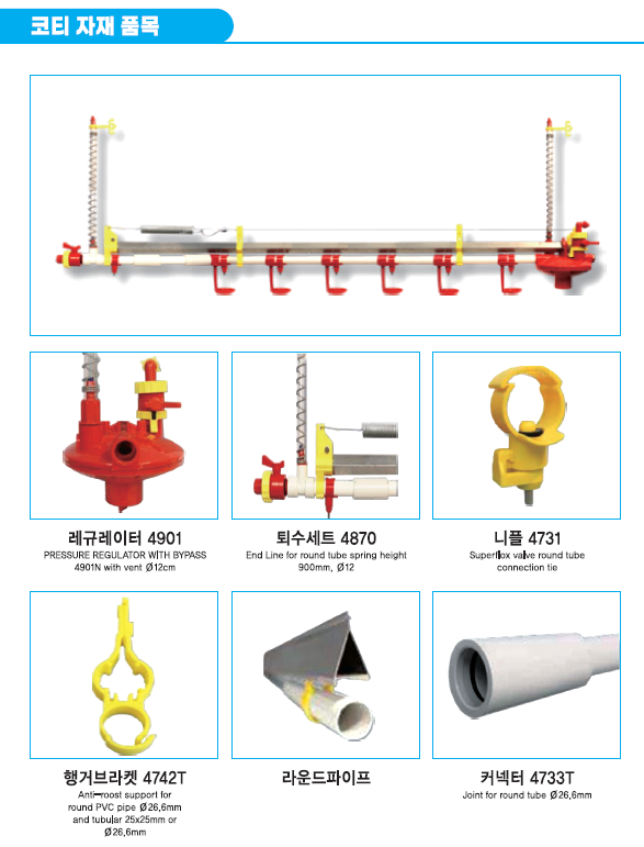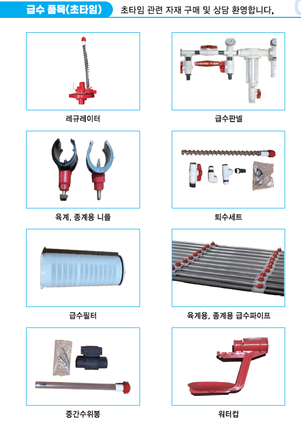 급수라인 뿐만 아니라 양계장 기자재 및 설비용 제품 다수 판매하고 있습니다.