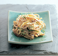 1_ 닭살을 찐 다음 가늘게 찢어서 소금, 후춧가루, 참기름으로 무친다.