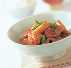4_ 냄비를 달궈 식용유를 두르고 고추와 닭고기를 볶다가 우엉과 연근 삶은 것을 넣고 볶는다.