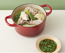 (닭 국물. 간장 1/2컵씩, 부추 30g, 연겨자 3큰술, 다진 청양고추, 식초 2큰술씩, 꿀 1큰술)