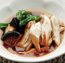 3_냄비에 다시마 물과 간장, 청주, 설탕, 조청, 마른 고추를 넣고 한소끔 끓인 뒤 1의 닭고기를 넣고 더 끓인다.