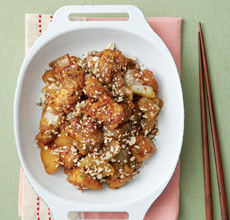 갈색이 되도록 살짝 볶다가 4의 튀긴 커리 닭과 2의 아몬드 슬라이스를 넣어 버무린 후 그릇에 담아낸다.