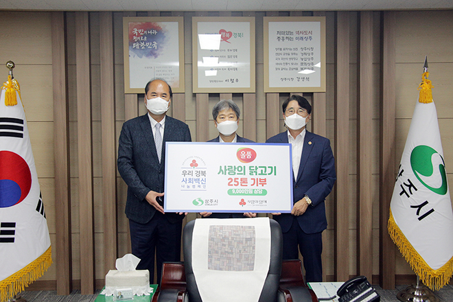(주)올품(대표이사 변부홍)은 지난 6월 23일 상주시청 시민의 방에서 ‘우리경북 사회백신 나눔 캠페인’의 하나로 저소득 가구와 사회복지시설을 위해 사랑의 닭고기 25톤(9,000만원 상당)을 기증했다.