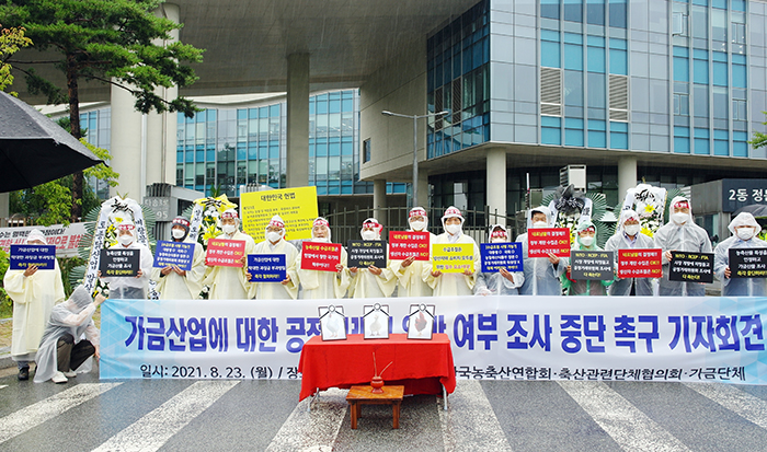 본회는 지난 8월 23일 공정거래위원회(이하 공정위) 앞에서 오리협회·토종닭협회·양계협회·육용종계부화협회와 공동으로 가금산업에 대한 공정거래위원회의 조사 중단을 촉구하는 기자회견을 개최했다.