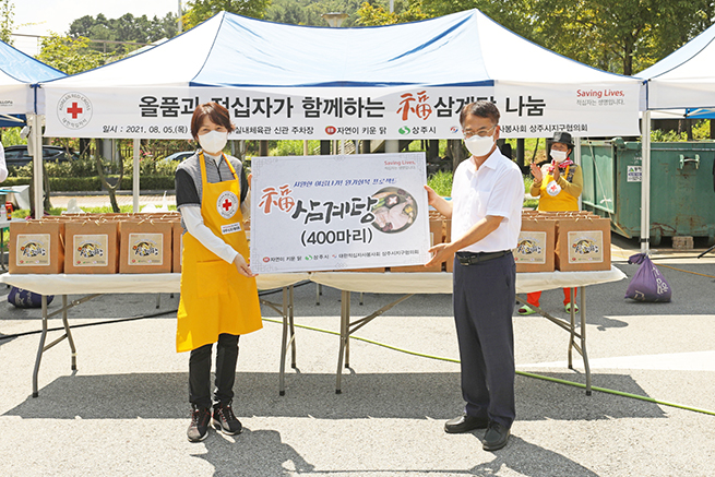 (주)올품(대표이사 변부홍)은 지난 8월 5일 대한적십자봉사회 상주시지구협의회와 삼계탕 및 밑반찬 400세트를 상주에 거주하는 폭염 취약 계층에 지원했다.