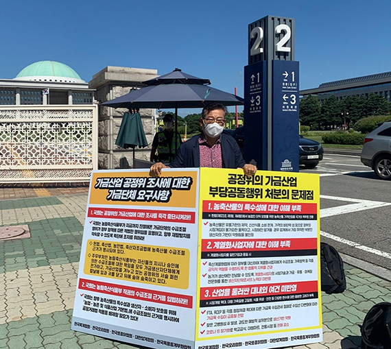본회는 지난 8월 13일부터 국회 의사당 정문에서 김상근 회장을 비롯 전 직원이 교대로 가금산업 공정거래위원회(이하 공정위) 조사 규탄 1인 릴레이 시위를 계속 진행하고 있다.