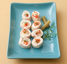 5_4에 녹말가루를 대강 뿌리고 치즈를 올린 다음 파프리카와 실파를 조금씩 넣고 돌돌 말아 종이 포일로 감싼다.