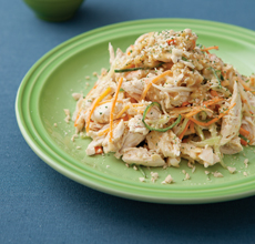 4_오이와 당근, 게살, 닭 살을 1의 땅콩 소스로 버무린 후 접시에 담고 굵게 다진 땅콩을 뿌려 먹는다.