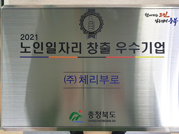 (주)체리부로가 2021년 12월 14일 충북도청 대회의실에서 열린 ‘2021년 노인일자리 창출 우수기업 인증식’에서 우수기업에 선정됐다.