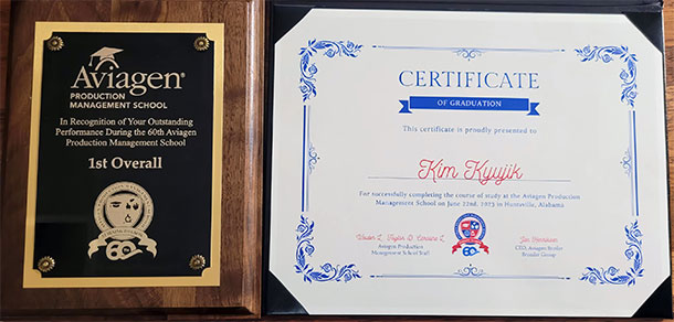 미국의 글로벌 원종계(GPS) 업체인 아비아젠사(알라바마 소재)가 금년 6월에 실시한 제60차 '아비아젠 스쿨'의 교육평가 결과, 한국 참석자 (주)체리부로(회장 김인식) 김규직 과장(34세, 수의사)이 1등을 차지했다고 밝혔다.
