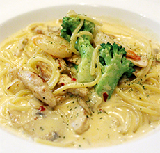 화이트치킨파스타는 고소한 크림소스에 닭가슴살이 함께 들어간 메뉴다. 이곳은 특히 크림파스타 맛이 좋다고 평이 났는데, 닭고기의 깔끔한 맛과 잘 어울린다. 닭고기, 브로컬리 외에는 별다른 부재료가 들어있지 않지만, 깊은 크림소스 맛만으로도 충분하다.