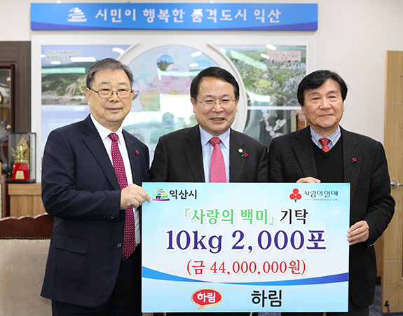 (주)하림은 지난해 12월 14일 이문용 대표이사를 비롯해 임직원 10여명이 익산시청을 방문해 백미 2000포(10㎏, 시가 4400만원)를 소외계층을 위해 써달라며 ‘사랑의 쌀’을 기탁했다. 기탁된 백미는 기초생활수급자와 차상위계층, 복지 사각지대에 있는 저소득 가구와 익산행복나눔마켓에 지원된다.