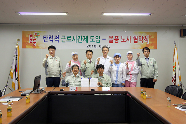 (주)올품은 지난 6월 14일 본사 소회의실에서 노사대표가 참석하여 ‘탄력적 근로시간제 도입’ 노사 협약식을 가졌다.