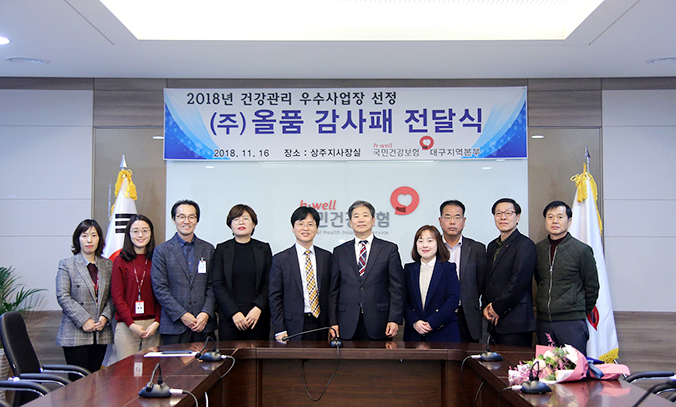 (주)올품(대표이사 변부홍)은 지난 11월 16일 경북 상주 국민건강보험공단 대회의실에서 ‘건강관리 우수사업장’으로 선정되어 감사패를 수여받았다.