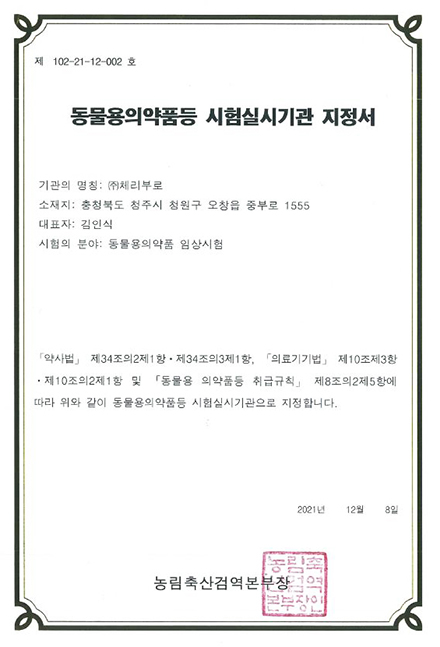 (주)체리부로, 동물약품 시험기관 지정받아