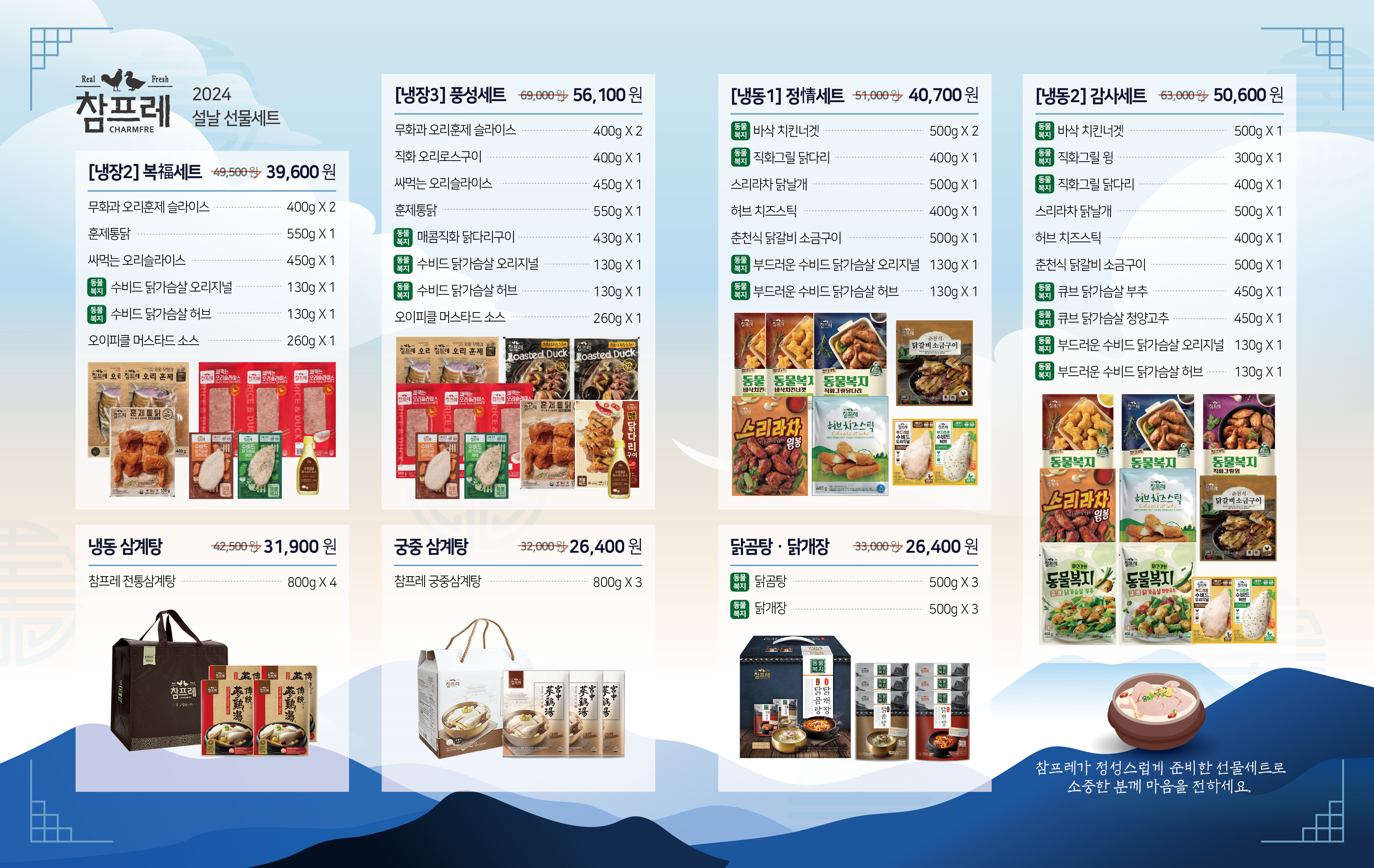 (주)참프레(대표이사 김재윤)는 2024년 설 선물세트 7종을 선보여 소비자들로 하여금 좋은 호응을 얻었다고 밝혔다.