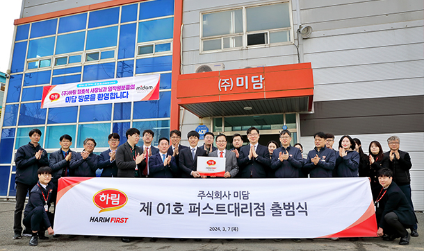 (주)하림이 가공식품 대리점과의 상생을 위해 지난 3월 7일 전북 익산시 왕궁면에 위치한 (주)미담 대리점에서 '퍼스트 대리점' 1호 출범식을 개최했다.