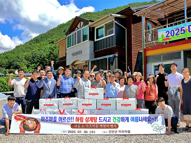 (주)하림(대표이사 정호석)이 중복을 하루 앞둔 지난 7월 29일 1사 1촌 자매결연을 통해 10년간 인연을 이어오고 있는 전북 진안군 마조마을을 찾아 여름 보양식 삼계탕을 선물했다고 밝혔다.