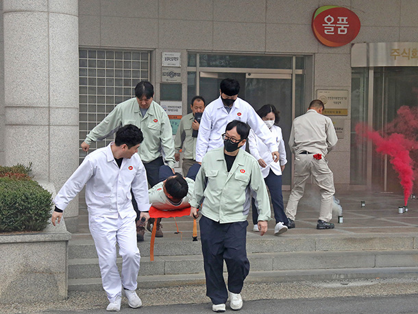(주)올품(대표이사 강기철)은 지난 10월 22일 올품 본사에서 상주 소방서와 함께 올품 자위소방대 소방 훈련을 실시했다.